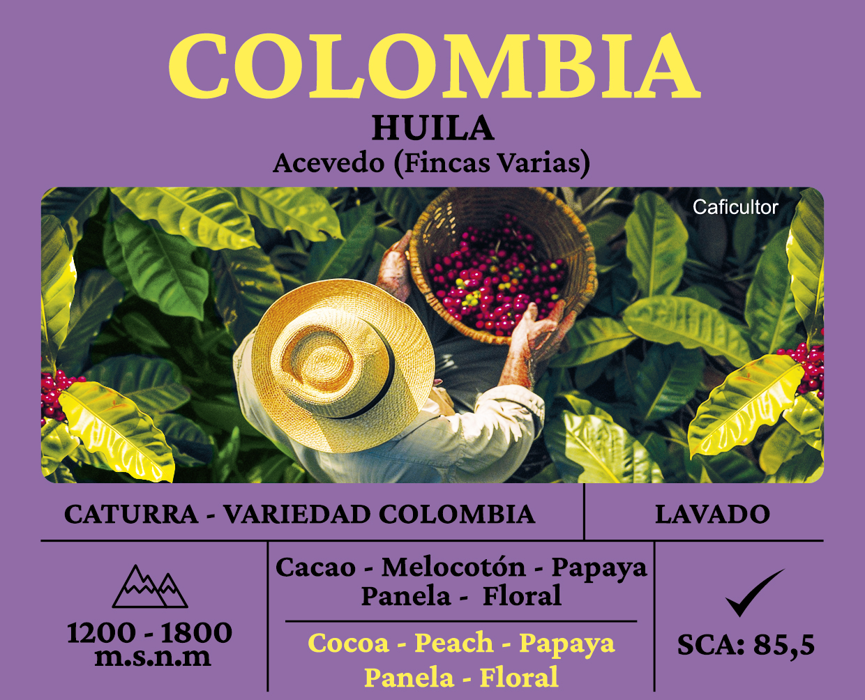 Este café de especialidad proveniente de Acevedo, Huila, combina la tradición cafetera colombiana con un perfil de taza vibrante y dulce. Su variedad Caturra – Variedad Colombia, procesado lavado, ofrece una taza limpia y equilibrada con notas destacadas de cacao, melocotón, papaya, panela y matices florales.